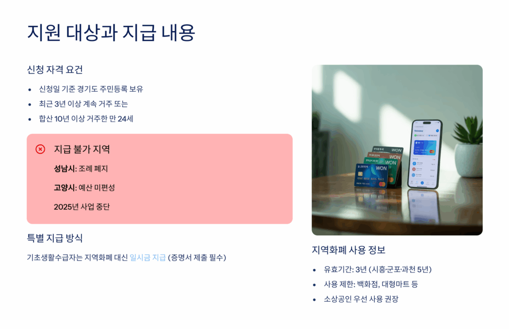 지역화폐는 두 가지 형태로 받을 수 있어요. 모바일 지역화폐와 카드형 지역화폐 중 선택할 수 있는데, 요즘은 대부분 모바일을 선호해요. 모바일 지역화폐는 ‘경기지역화폐’ 앱을 다운받아서 사용하면 돼요. QR코드로 결제하거나 온라인 쇼핑몰에서도 사용 가능해요!