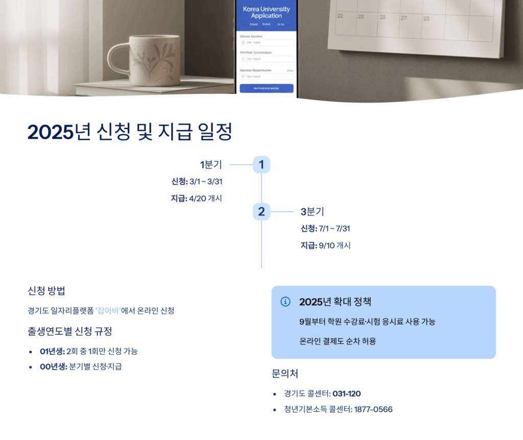 신청 시작일은 매 분기 첫 달 15일경이에요. 정확한 날짜는 경기도 공식 홈페이지나 잡아바 앱에서 사전 공지해요. 신청 마감일은 보통 다음 달 말일이에요. 예를 들어 1분기는 1월 15일부터 2월 28일까지 신청받는 식이죠!