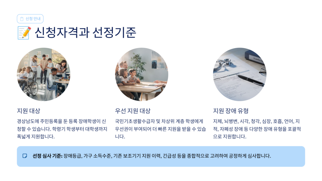 경남 장애학생 보조기기 지원을 받으려면 먼저 특수교육대상자로 선정되어 있어야 해요. 특수교육대상자는 시각장애, 청각장애, 지적장애, 지체장애, 정서·행동장애, 자폐성장애, 의사소통장애, 학습장애, 건강장애, 발달지체 등 10개 장애 영역 중 하나 이상에 해당하는 학생들이랍니다. 경상남도 내 유치원, 초등학교, 중학교, 고등학교, 특수학교에 재학 중인 학생이면 누구나 신청할 수 있어요.