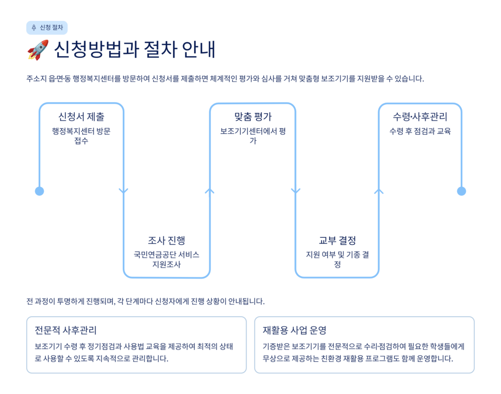 긴급 지원 제도도 운영되고 있어요. 갑작스러운 사고나 질병으로 장애가 발생한 학생, 보조기기 파손으로 학습에 심각한 지장이 있는 학생 등은 일반 신청 기간이 아니어도 긴급 지원을 신청할 수 있답니다. 이 경우 간소화된 절차를 통해 2주 이내에 지원 여부가 결정돼요.