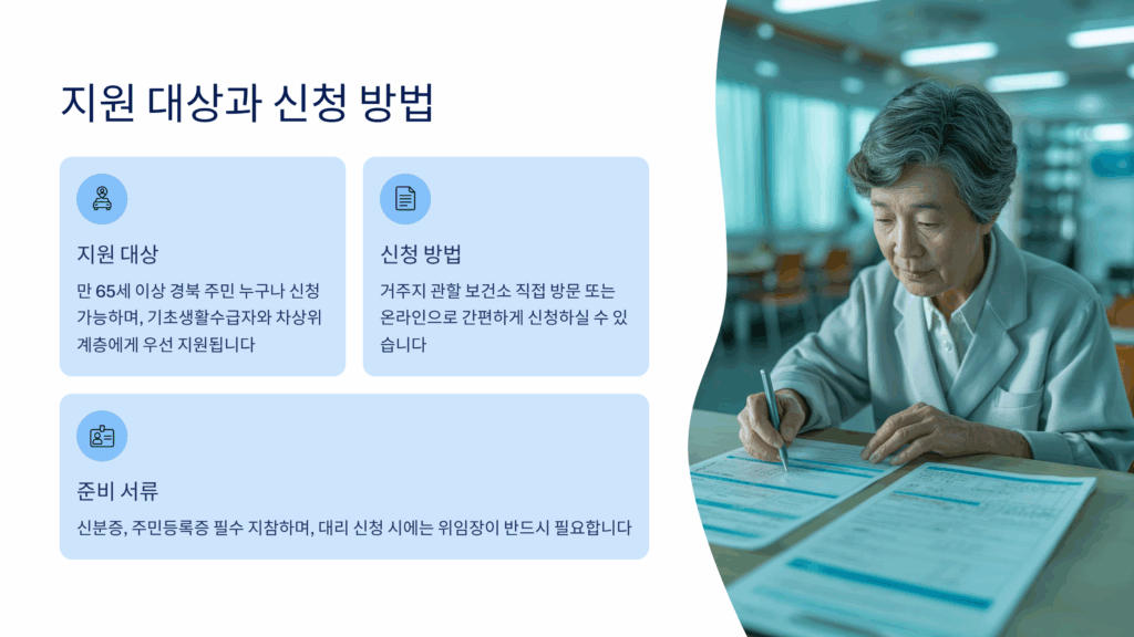 A1. 만 65세 이상이고 경북도에 6개월 이상 거주하신 분 중 기준중위소득 150% 이하 가구에 속하시면 신청 가능해요. 기초수급자와 차상위계층은 우선 지원됩니다.