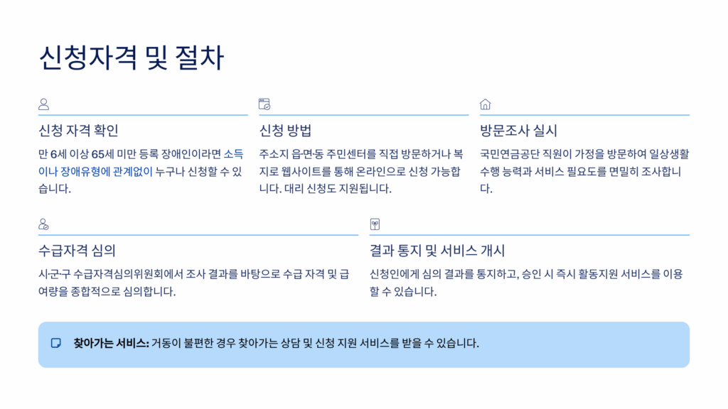 신청 절차를 자세히 설명하면, 먼저 읍면동 주민센터에 신청서를 제출하고, 시군구에서 신청 자격을 확인해요. 그 다음 국민연금공단에서 서비스 지원 종합조사를 실시하는데, 조사원이 직접 방문해서 일상생활 수행능력 등을 평가한답니다. 조사 결과는 시군구 수급자격심의위원회에서 심의하고, 최종적으로 활동지원등급이 결정돼요. 전체 과정은 신청일로부터 30일 이내에 완료되는 것이 원칙이랍니다.