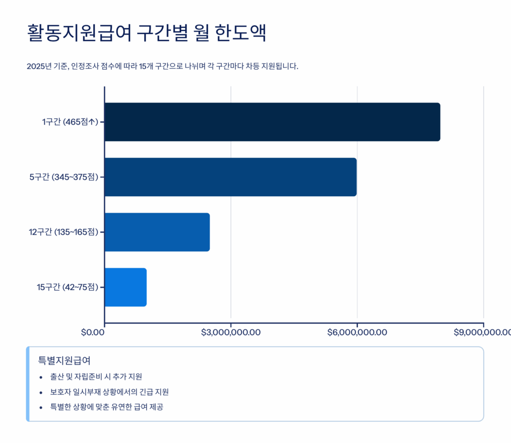 활동지원 서비스를 받기 위해서는 먼저 국민연금공단에서 실시하는 서비스 지원 종합조사를 받아야 해요. 이 조사는 일상생활동작, 수단적 일상생활동작, 인지행동특성, 사회활동 등 총 4개 영역을 평가하게 되고, 조사 결과에 따라 활동지원등급이 결정된답니다. 등급은 1구간부터 15구간까지 나뉘며, 구간별로 월 한도액이 차등 지급되고 있어요. 1구간의 경우 월 최대 480시간까지 지원받을 수 있답니다.