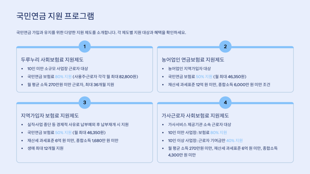 국민연금 지원금을 받기 위해서는 각 제도별로 정해진 자격 조건을 충족해야 해요. 두루누리 사회보험료 지원의 경우, 근로자 수 10명 미만 사업장에서 월평균 보수가 270만원 미만인 근로자가 대상이에요. 신규가입자는 보험료의 80%를, 기존 가입자는 50%를 지원받을 수 있어요. 사업장 규모는 매월 말일 기준으로 판단하며, 건설업이나 제조업 등 일부 업종은 예외 규정이 적용돼요.
