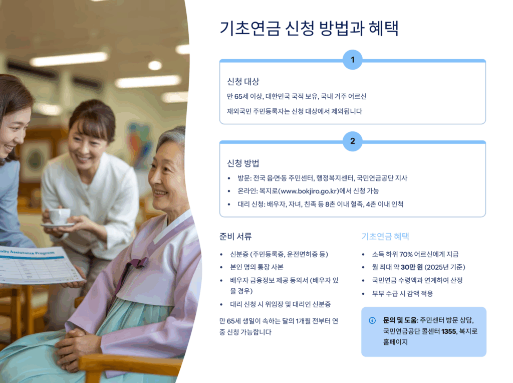 신청 대상은 만 65세 이상 대한민국 국적을 가진 국내 거주자로, 소득인정액이 선정기준액 이하인 분들이에요. 2025년 기준으로 단독가구는 월 213만원, 부부가구는 월 340만 8천원 이하일 때 신청 가능해요. 소득인정액은 소득평가액과 재산의 소득환산액을 합산한 금액으로 계산되니까 정확한 계산이 필요해요.