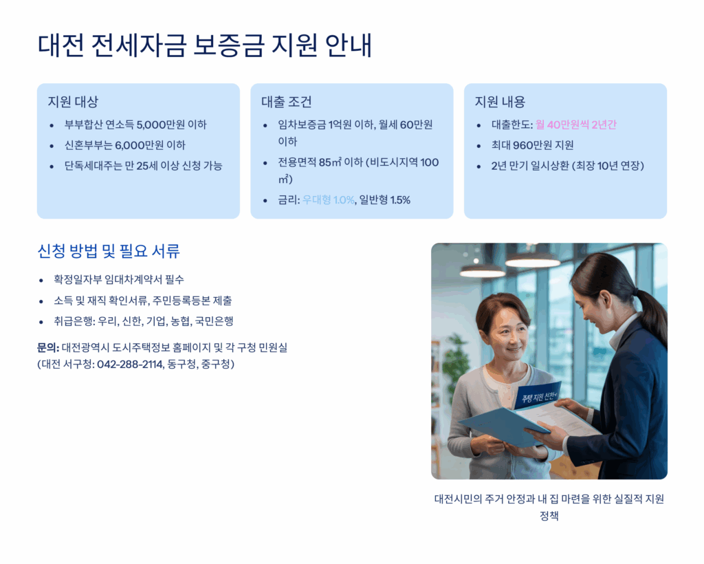 본 정보는 2025년 1월 기준으로 작성되었으며, 정책 변경에 따라 내용이 달라질 수 있습니다. 실제 대출 신청 시에는 해당 금융기관이나 대전시청에 최신 정보를 확인하시기 바랍니다. 개인의 신용도와 소득 수준에 따라 대출 조건이 달라질 수 있으며, 본 내용은 일반적인 정보 제공 목적으로만 활용하시기 바랍니다.