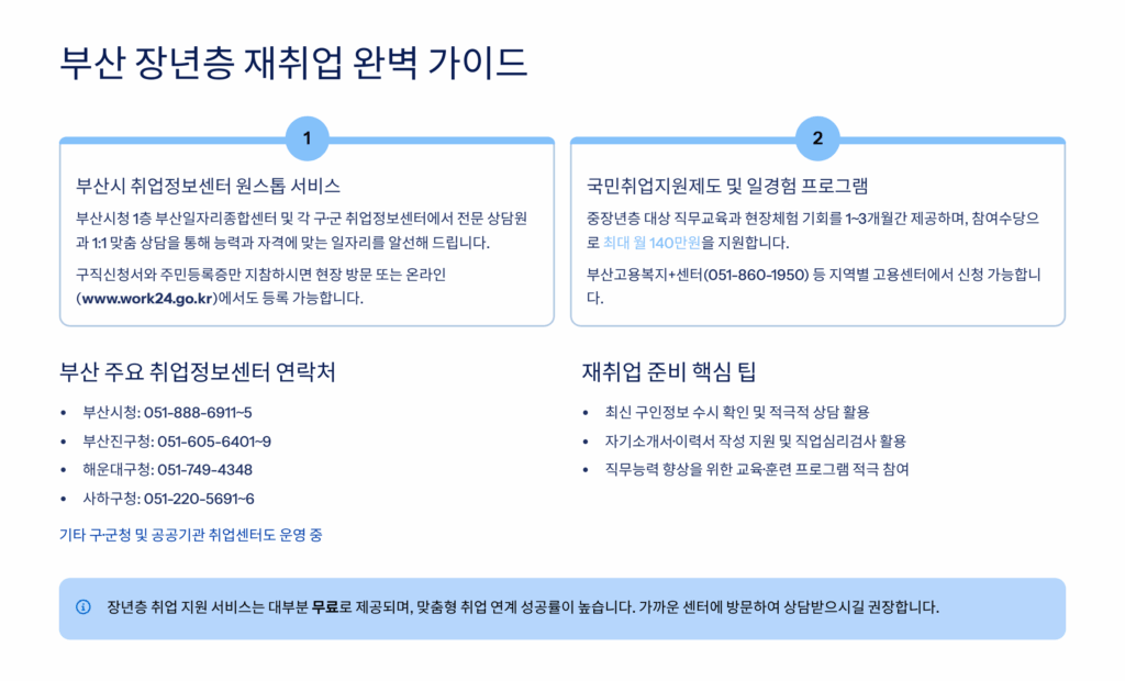 본 글은 2025년 1월 기준 부산시 장년층 재취업 지원 정보를 제공하는 것으로, 정책과 프로그램은 변경될 수 있습니다. 구체적인 신청 자격과 절차는 해당 기관에 직접 문의하시기 바랍니다. 개인의 상황에 따라 결과가 다를 수 있으며, 본 정보는 참고용으로만 활용하시기 바랍니다.
