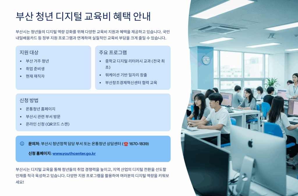 부산시에서 청년들의 디지털 역량 강화를 위해 교육비를 지원하는 사업이 시행되고 있어요. 이 제도는 만 19세부터 34세까지의 부산 청년들이 IT 관련 교육을 받을 때 비용 부담을 덜어주는 정책이에요. 코딩, 웹디자인, 데이터 분석 등 다양한 디지털 분야의 교육을 받고 싶지만 경제적 부담 때문에 망설였던 청년들에게 정말 좋은 기회가 되고 있답니다.