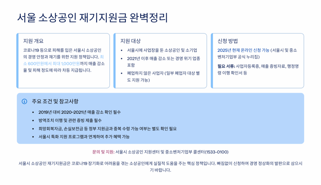 본 글은 2025년 1월 기준 서울시 소상공인 재기지원금 정책을 안내한 것으로, 실제 정책은 변경될 수 있습니다. 정확한 정보는 서울시 공식 홈페이지나 소상공인지원센터를 통해 확인하시기 바랍니다. 본 정보는 일반적인 안내 목적으로 작성되었으며, 개별 상황에 따라 지원 조건이 달라질 수 있습니다.