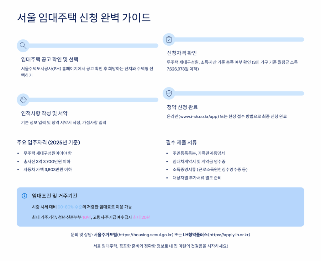 서울 임대주택 신청의 기본 자격은 무주택 세대구성원이에요. 세대구성원 전원이 주택을 소유하지 않아야 하며, 이는 배우자와 미혼 자녀를 포함해요. 단독세대주의 경우 만 30세 이상이거나 미성년 자녀를 부양하는 경우에만 신청 가능해요. 청약통장 가입 기간과 납입 횟수도 중요한 평가 요소랍니다.