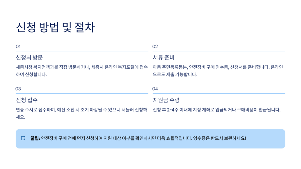 온라인 신청 절차는 정말 간단해요. 먼저 세종시 통합예약포털에 회원가입을 하고, 본인인증을 완료해요. 그다음 ‘아동안전장비 지원금 신청’ 메뉴를 찾아서 클릭하면 신청 페이지로 이동해요. 여기서 아동 정보, 구매 제품 정보, 계좌 정보 등을 입력하고 필요 서류를 첨부하면 끝이에요!