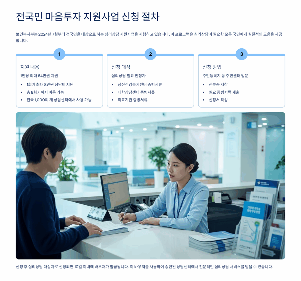 심리상담 지원금은 크게 국가 차원의 지원과 지자체별 지원으로 나뉘어요. 보건복지부에서 운영하는 ‘통합정신건강증진사업’은 전국 정신건강복지센터를 통해 무료 상담을 제공하고 있답니다. 청년층을 위한 ‘청년마음건강지원사업’은 만 19세에서 34세 청년에게 연간 10회기의 상담을 지원해요. 여성가족부의 ‘가족상담 지원사업’은 가족 갈등으로 어려움을 겪는 가정에 전문 상담을 제공하고 있어요.
