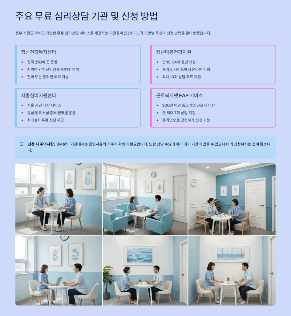 신청 시 주의사항도 있어요. 서류는 최근 1개월 이내 발급된 것이어야 하며, 스캔이나 사진 파일로 제출할 때는 선명하게 찍어야 해요. 개인정보는 필요한 부분만 공개하고 나머지는 마스킹 처리할 수 있답니다. 신청서 작성 시 상담받고 싶은 주요 문제와 희망 상담 형태(개인/집단)를 명확히 기재하는 것이 좋아요.