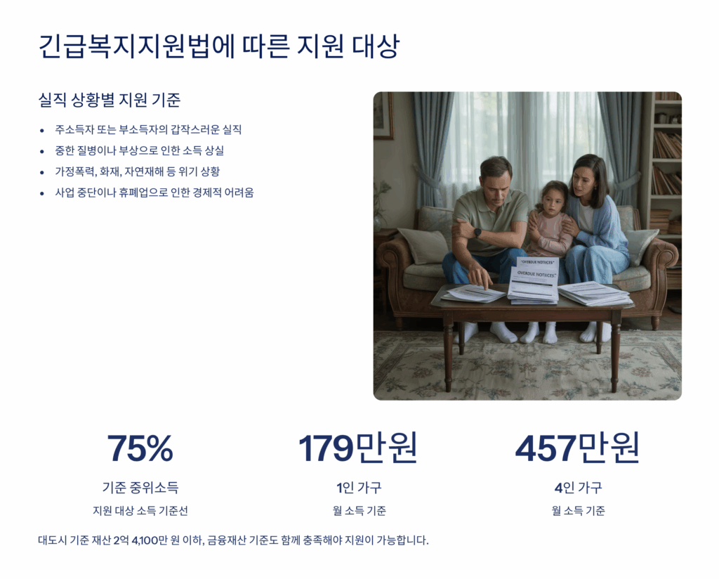 A25. 현재 가구소득이 기준중위소득 100% 이하면 신청 가능해요. 실직 전 소득은 고려하지 않으며, 실직 후 현재 상황을 기준으로 심사해요.