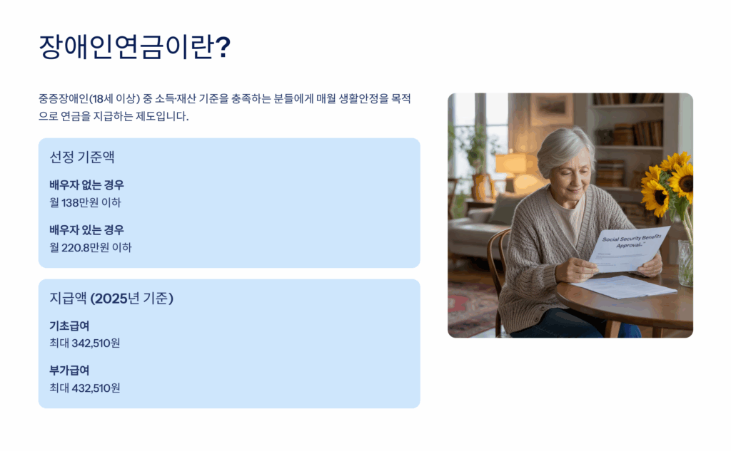 A2. 만 18세 이상 중증장애인(종전 1~2급, 3급 중복)으로 소득인정액이 선정기준액 이하면 신청 가능해요. 2025년 기준 단독가구 130만원, 부부가구 208만원이에요.