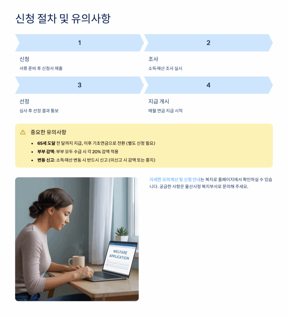 신청 시 주의사항도 알려드릴게요. 허위 서류를 제출하면 부정수급으로 처벌받을 수 있어요. 소득이나 재산 변동이 있으면 반드시 신고해야 하고, 주소 변경 시에도 알려야 해요. 울산시는 정기적으로 수급자격을 확인하니 성실하게 신고하는 것이 중요해요. 연금 지급이 시작되면 매년 1회 수급자격 확인 조사를 받게 되어요! 💡