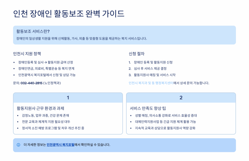 본 정보는 2024년 기준 인천시 장애인 활동지원 서비스 안내를 목적으로 작성되었습니다. 정책과 지원 내용은 변경될 수 있으므로, 신청 전 반드시 인천시청이나 거주지 구청에 최신 정보를 확인하시기 바랍니다. 개인별 상황에 따라 지원 내용이 달라질 수 있으며, 본 안내가 법적 효력을 갖지 않음을 알려드립니다.