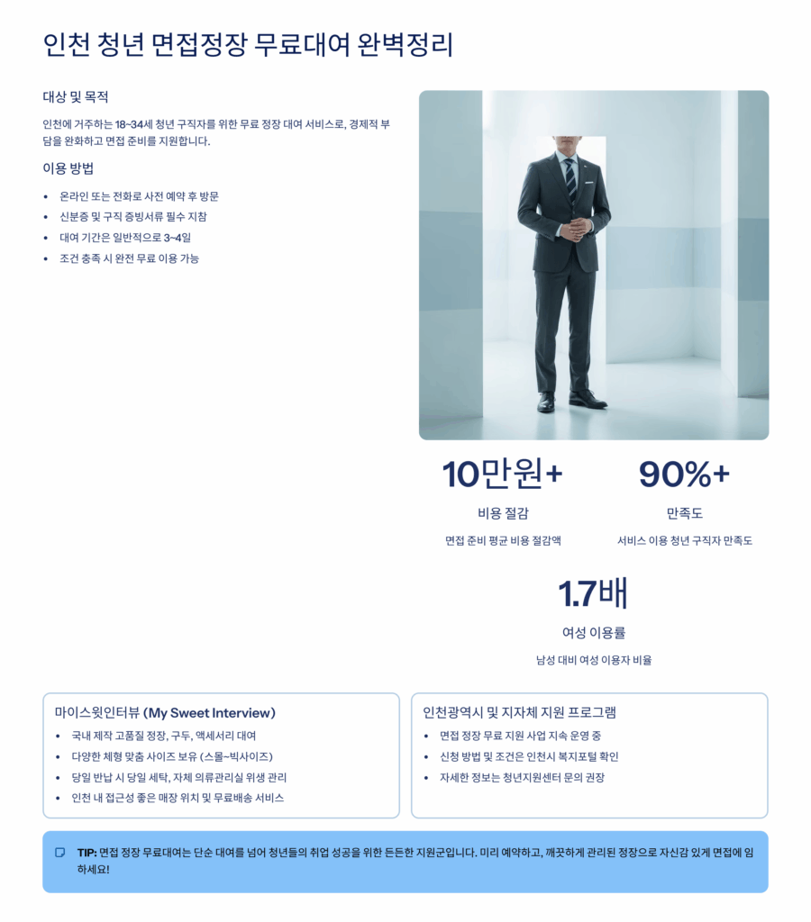 본 글은 2025년 1월 기준으로 작성되었으며, 인천시 청년 면접정장 무료대여 서비스의 세부 사항은 변경될 수 있습니다. 정확한 정보는 인천일자리포털(job.incheon.go.kr) 또는 인천시 청년지원센터(032-875-3098)로 문의하시기 바랍니다. 본 정보는 일반적인 안내를 목적으로 하며, 개인의 상황에 따라 이용 조건이 다를 수 있습니다.