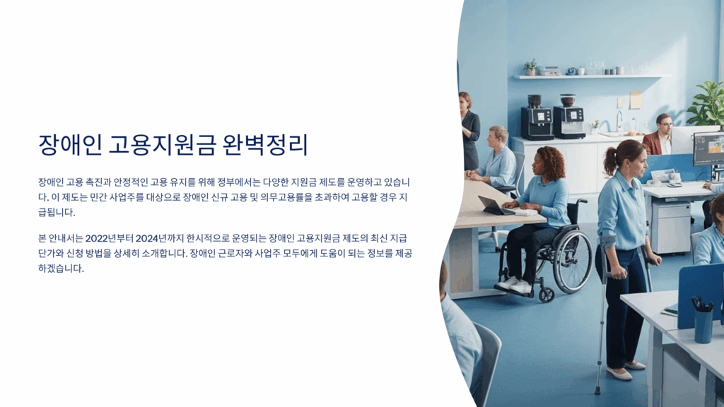 본 글은 2025년 1월 기준 정보를 바탕으로 작성되었으며, 정책 변경에 따라 내용이 달라질 수 있어요. 정확한 정보는 한국장애인고용공단(1588-1519) 또는 공식 홈페이지(www.kead.or.kr)에서 확인하시기 바랍니다. 본 정보는 일반적인 안내 목적으로 제공되며, 개별 상황에 대한 법률적 조언을 대체할 수 없습니다.