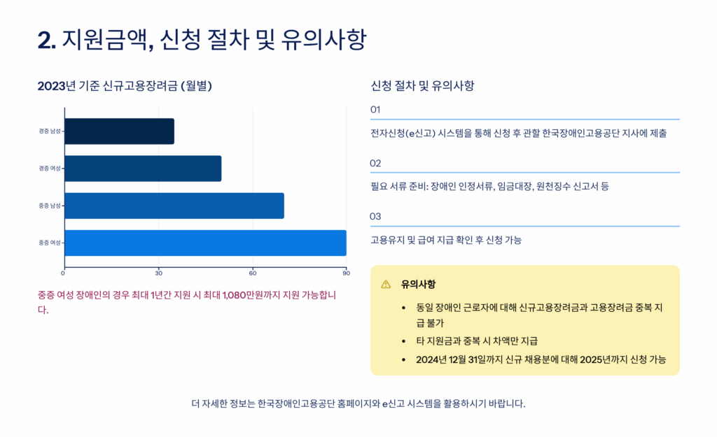 고용장려금 외에도 ‘신규고용장려금’이라는 제도가 있어요. 이는 장애인을 신규로 채용할 때 첫 1년간 추가로 지급되는 지원금이에요. 월 최대 30만원이 추가 지원되며, 청년 장애인(만 15~34세)의 경우 50만원까지 받을 수 있어요. 이 제도는 기업의 초기 부담을 크게 덜어주는 역할을 하고 있답니다.