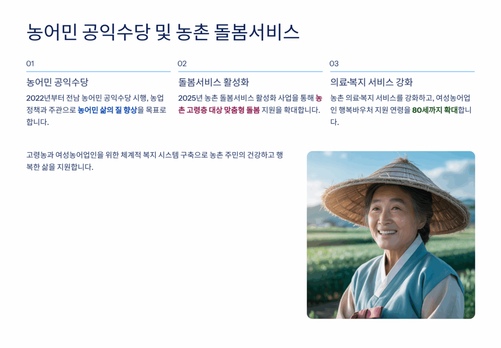 전라남도는 65세 이상 고령농업인이 전체 농업인구의 50%를 넘어서면서 전국에서 가장 적극적인 고령농 지원정책을 펼치고 있어요. 2025년 현재 전남도는 고령농업인의 안정적인 영농활동과 노후생활 보장을 위해 다양한 맞춤형 지원사업을 시행하고 있답니다.