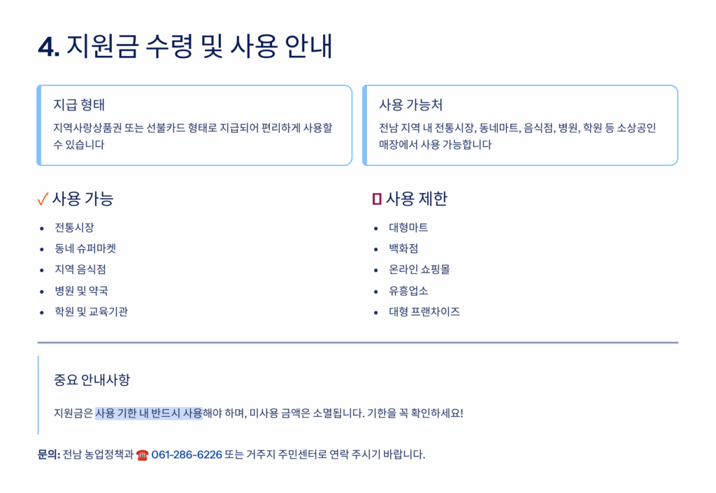 본 정보는 2025년 1월 기준으로 작성되었으며, 정책 변경에 따라 내용이 달라질 수 있습니다. 정확한 정보는 전라남도청 공식 홈페이지나 관할 기관에 직접 확인하시기 바랍니다. 본 글은 일반적인 정보 제공 목적으로 작성되었으며, 개별 상황에 따른 법적 조언을 대체할 수 없습니다.