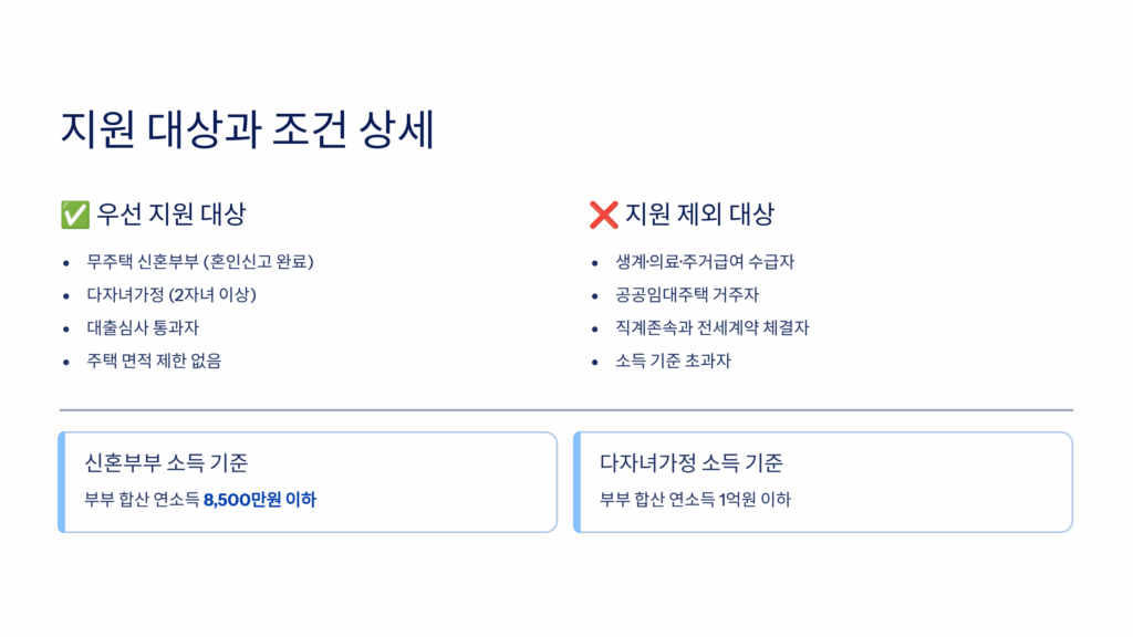 소득기준은 부부합산 연소득 7천만원 이하로 설정되어 있어요. 이는 도시근로자 월평균소득의 약 120% 수준으로, 맞벌이 부부도 충분히 지원받을 수 있는 기준이랍니다. 재산기준의 경우 부동산과 자동차를 포함한 총 재산이 3억원을 초과하지 않아야 해요. 단, 주택을 소유하고 있지 않은 무주택자여야 한다는 조건이 있어요.