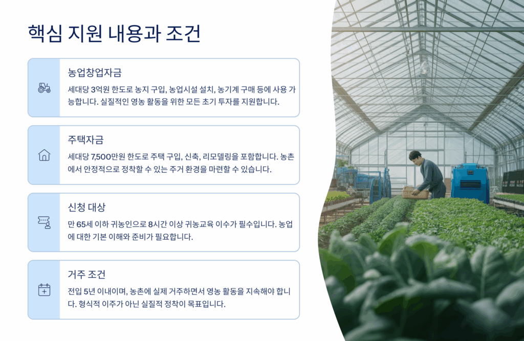 교육 이수 조건도 있어요. 귀농 교육을 100시간 이상 이수해야 하는데, 온라인 40시간, 오프라인 60시간으로 구성됩니다. 농림축산식품부가 지정한 귀농귀촌 교육기관에서 받은 교육만 인정되며, 전입 전후 모두 가능해요. 영농 기초 기술, 농촌 생활 적응, 농업 경영 등의 내용이 포함된답니다.