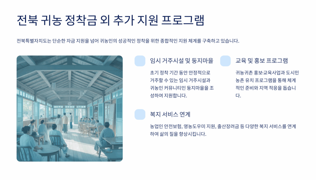 지원금 외에도 귀농인의 집 운영, 영농 체험 프로그램, 귀농 아카데미 등 다양한 프로그램이 준비되어 있어요. 귀농인의 집은 최대 6개월간 무료로 거주하며 지역을 탐색할 수 있는 기회를 제공합니다. 영농 체험 프로그램은 실제 농사를 지어보며 적성을 확인할 수 있는 좋은 기회가 되고 있어요.