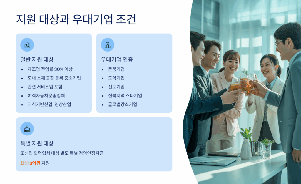 특별 우대 대상 기업도 있어요. 청년기업(대표자 만 39세 이하), 여성기업, 장애인기업, 사회적기업 등은 심사 시 가점을 받을 수 있답니다. 또한 전북도가 지정한 유망중소기업, 강소기업, 수출유망중소기업 등도 우대 혜택을 받을 수 있어요. 이들 기업은 금리 인하, 지원 한도 상향, 상환기간 연장 등의 혜택을 추가로 받을 수 있답니다.