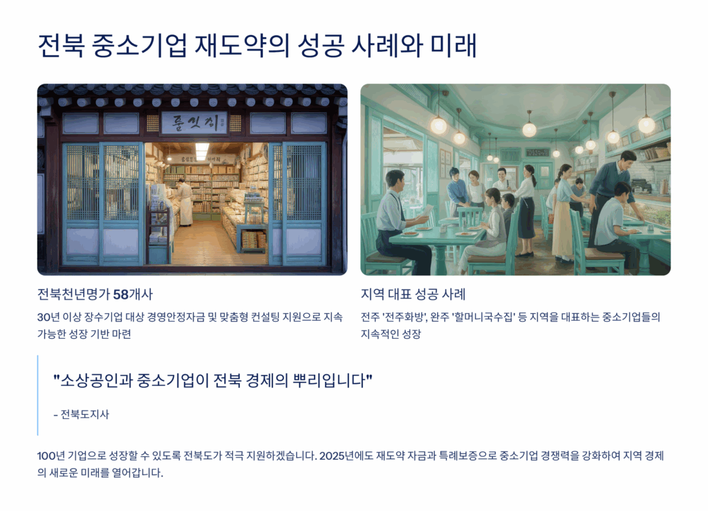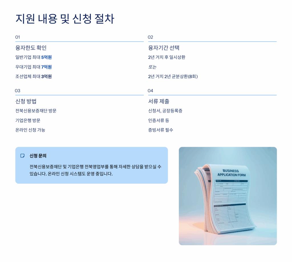 부대 지원 서비스도 충실해요. 자금 지원과 함께 무료 경영컨설팅, 기술지도, 마케팅 지원 등을 받을 수 있답니다. 전북테크노파크의 기술 전문가들이 생산공정 개선을 도와주고, 전북경제통상진흥원은 국내외 판로개척을 지원해요. 이러한 종합 지원을 통해 단순한 자금 지원을 넘어 기업의 근본적인 경쟁력 강화를 도모하고 있답니다.