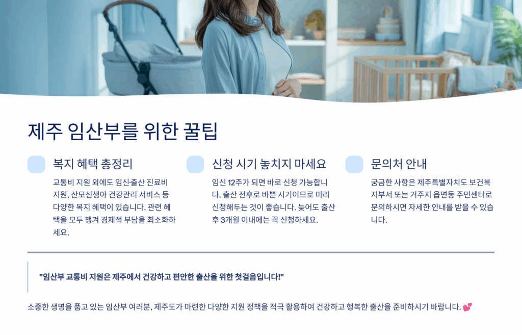나의 경험상 이런 통합 지원이 정말 큰 도움이 되었어요. 교통비 신청하러 갔다가 다른 지원 제도도 안내받아서 놓칠 뻔한 혜택들을 모두 받을 수 있었거든요. 제주도의 임산부 지원은 단순한 현금 지원을 넘어 토털 케어 시스템으로 발전하고 있어요! 🌟