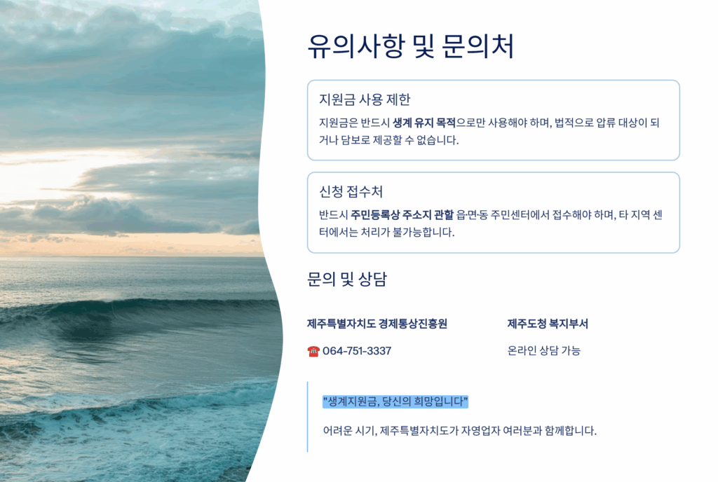 제주도에서 자영업을 운영하시는 분들에게 이 생계지원금은 단순한 일회성 지원이 아닌, 사업 재도약의 발판이 될 수 있어요. 어려운 시기를 극복하고 더 나은 미래를 준비하는 데 실질적인 도움이 되길 바랍니다! 💪