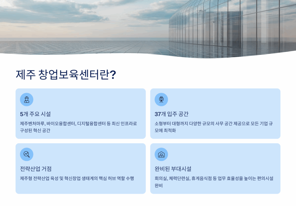 제주 창업보육센터는 예비창업자와 초기 창업기업을 위한 종합 지원 시설로, 제주도의 창업 생태계 활성화를 위해 운영되고 있어요. 특히 제주만의 지역 특성을 살린 관광, IT, 바이오, 농수산 분야 창업을 집중 지원하며, 입주 기업에게 사무공간, 멘토링, 투자 연계 등 다양한 혜택을 제공하고 있답니다.