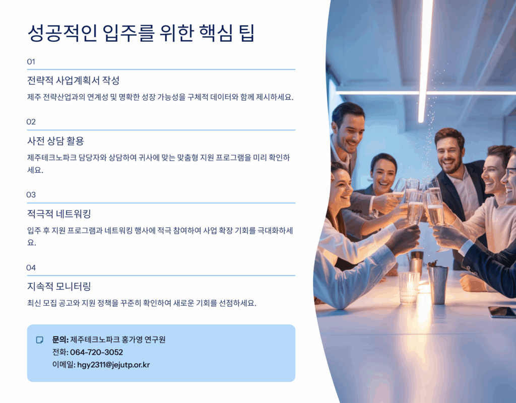 네트워킹과 협업 기회도 풍부해요. 같은 센터에 입주한 기업들과 자연스럽게 교류하며 협업 기회를 찾을 수 있고, 정기적인 네트워킹 행사를 통해 인맥을 넓힐 수 있어요. 투자자 초청 IR 행사, 바이어 상담회, 제품 전시회 등도 개최되어 사업 기회를 확대할 수 있답니다. 제주의 경우 관광객이 많아 테스트베드로 활용하기 좋고, 다양한 관광 관련 기업과의 협업 기회도 많아요. 입주 기업 간 공동 프로젝트나 컨소시엄 구성도 활발하게 이루어지고 있어요! 🤝