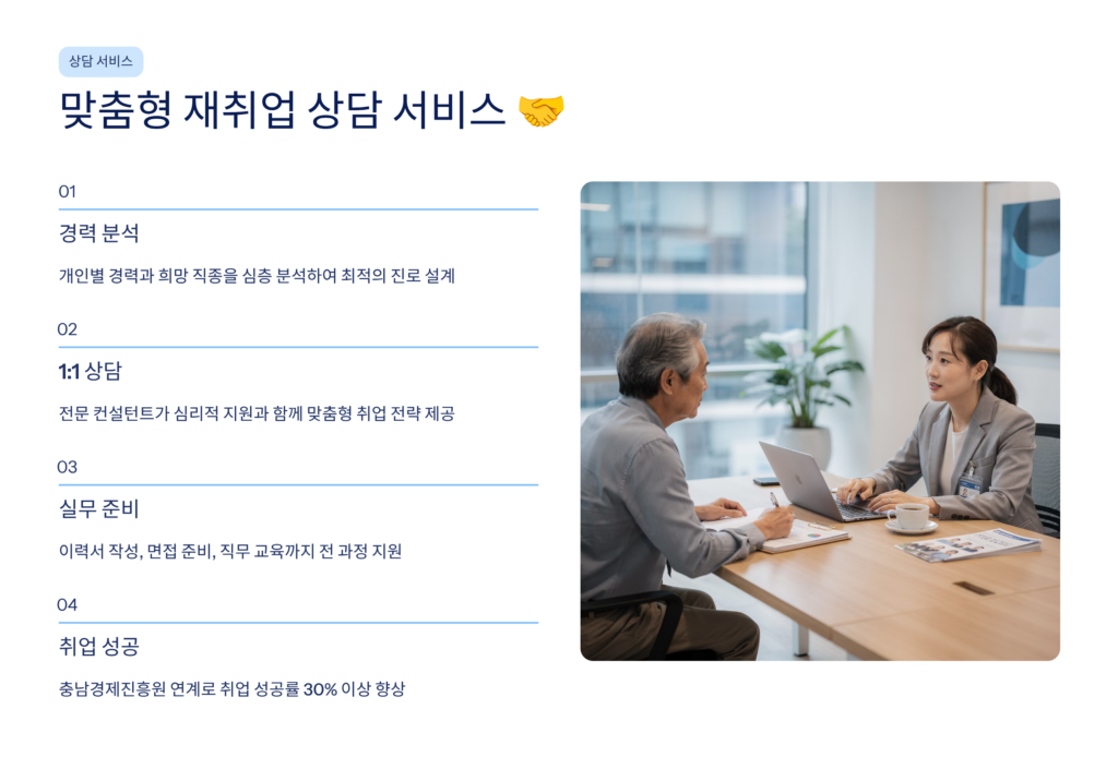 ✅ 체계적인 상담 시스템: 전문 상담사의 1:1 맞춤 상담으로 개인별 최적의 재취업 경로 설계