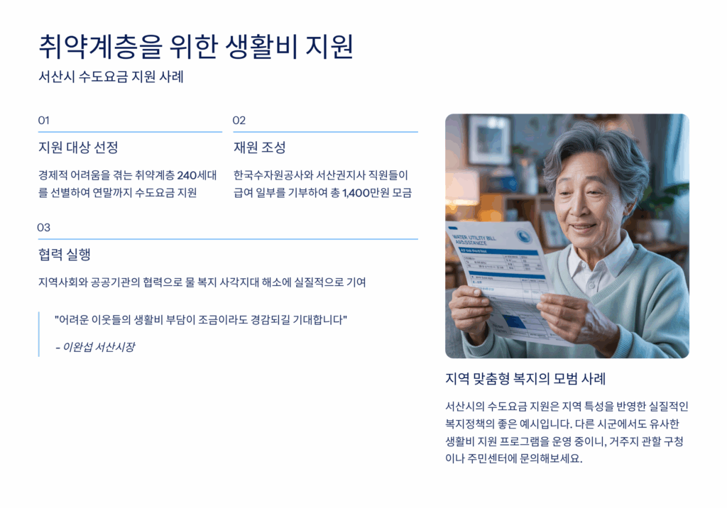 실생활 도움: 일상생활의 불편함을 해소하고, 문화여가 활동도 즐길 수 있어요. 가족 구성원 모두가 혜택을 받을 수 있는 종합적인 지원 체계예요.