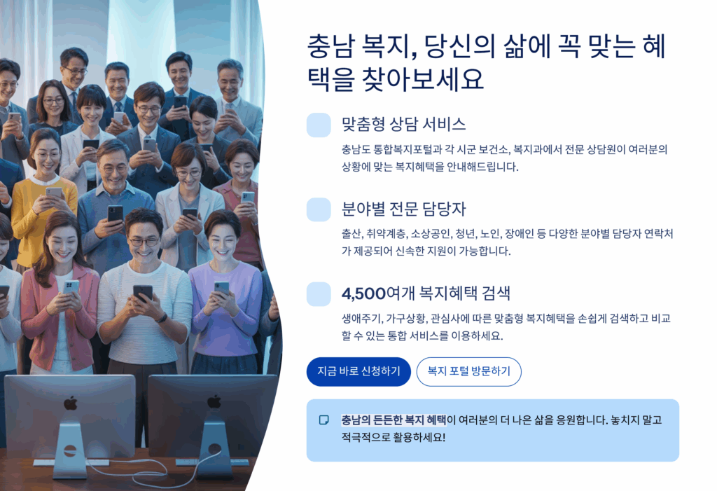 복지 상담 창구도 다양해요. 보건복지상담센터(129)는 365일 24시간 운영되고, 충남도 복지정책과(041-635-4241)에서도 상담이 가능해요. 각 시군별 복지 전용 콜센터도 있어서 지역 특화 복지사업 안내를 받을 수 있어요. 카카오톡 ‘충남복지톡’ 채널을 추가하면 실시간 상담과 복지 정보를 받아볼 수 있답니다.