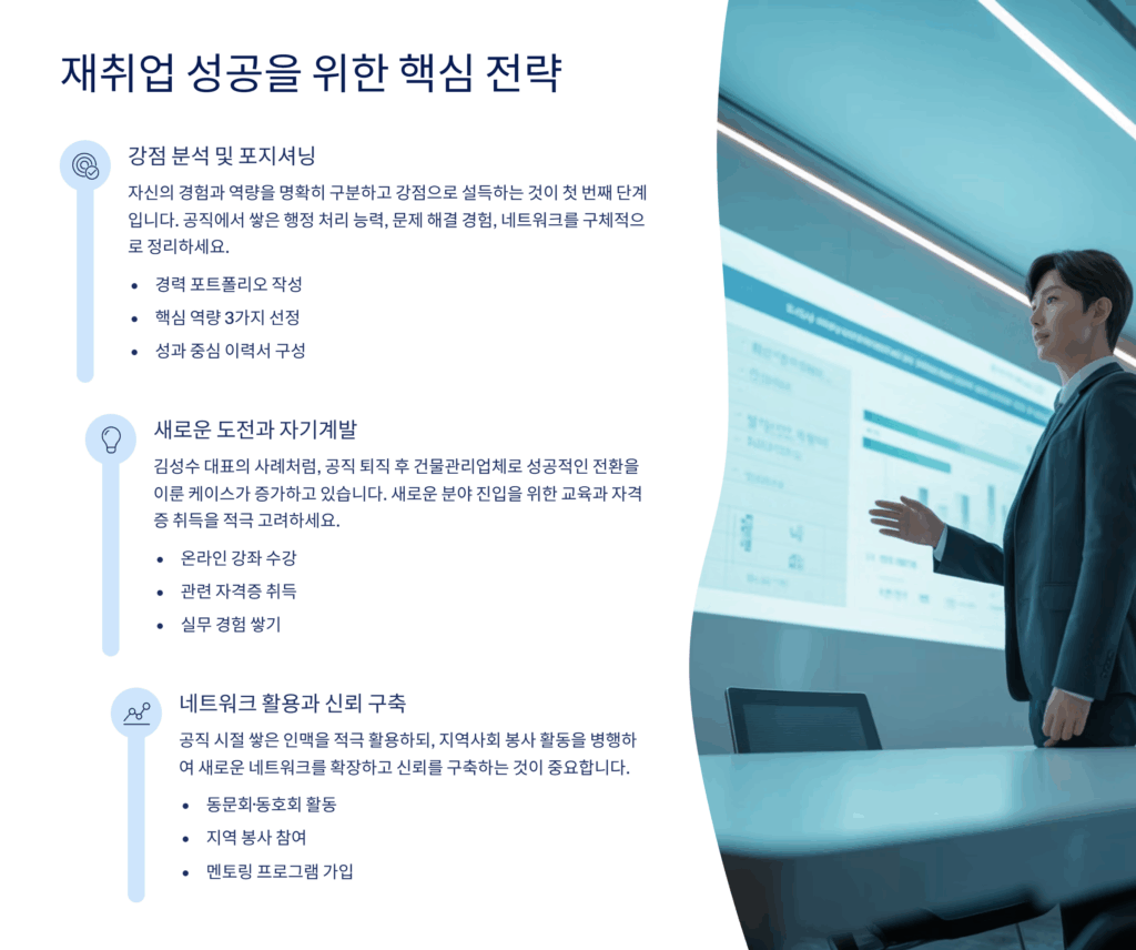 셋째, 네트워킹을 적극 활용해야 해요. 공직 생활 동안 쌓은 인맥은 재취업의 큰 자산이 될 수 있답니다. 동기, 선후배, 업무 관계자들과 지속적으로 교류하며 정보를 공유하세요. 충남 퇴직공무원 협회, 동호회, 스터디 그룹 등에 참여하여 네트워크를 확대하는 것도 좋아요. 실제로 재취업자의 40% 이상이 지인 소개로 일자리를 찾았다는 통계가 있어요.