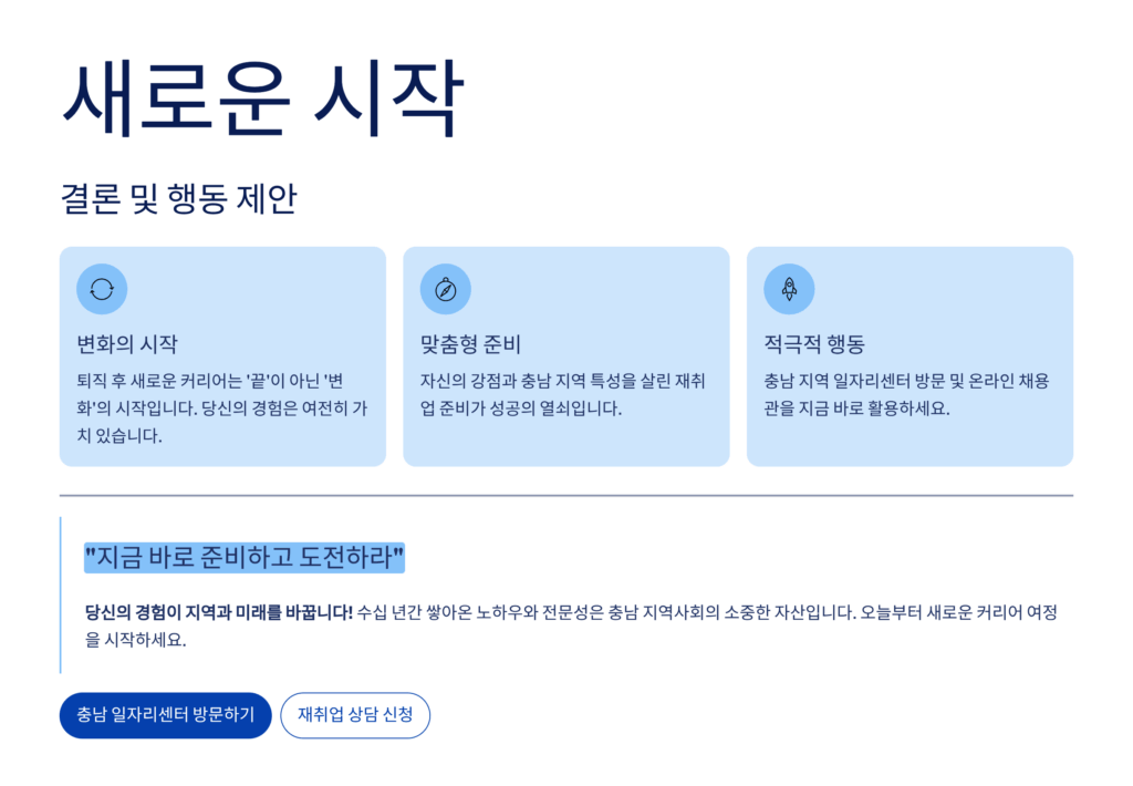 본 정보는 2025년 1월 기준으로 작성되었으며, 정책 변경에 따라 내용이 달라질 수 있습니다. 정확한 정보는 충남도청 및 각 시군 재취업 지원센터에 직접 문의하시기 바랍니다. 개인별 상황에 따라 지원 내용이 다를 수 있으며, 모든 프로그램 참여는 자격 심사를 거쳐 결정됩니다.