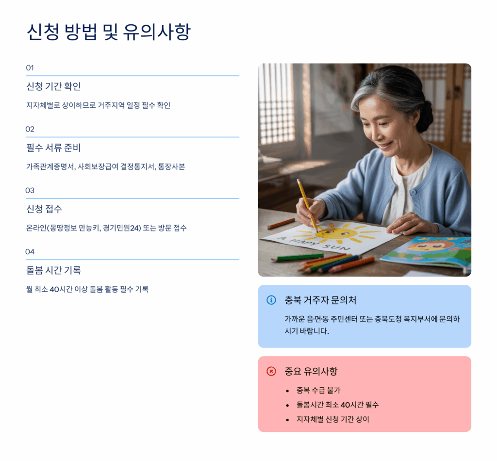 서비스 신청은 여러 경로로 가능해요. 오프라인으로는 주민센터, 시군청 복지과, 가족센터 등에서 신청할 수 있고, 온라인으로는 ‘충북 돌봄넷(care.cb.go.kr)’이나 ‘복지로’ 사이트를 통해 신청 가능하답니다. 전화로는 충북도 돌봄 콜센터(043-1377)를 이용하면 돼요. 신청 시 필요한 서류는 신분증, 건강보험증, 소득증명서류 정도예요.